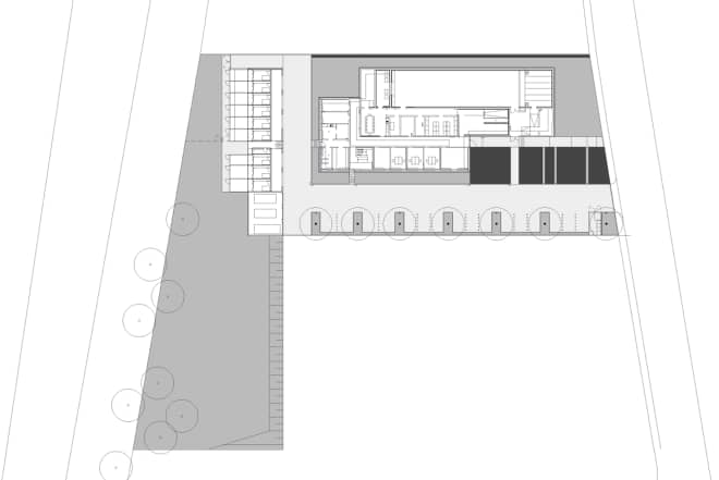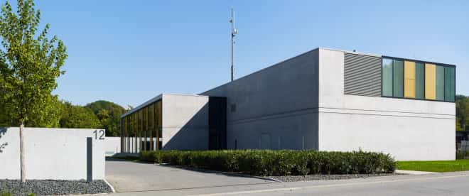 In Entsprechung zur Architektur wird auch der Freiraum des Grundstückes klar und funktional gegliedert. Im Eingangsbereich zur Raumschießanlage führen ein Weg und eine Rampe aus Ortbeton auf das Gebäude zu.