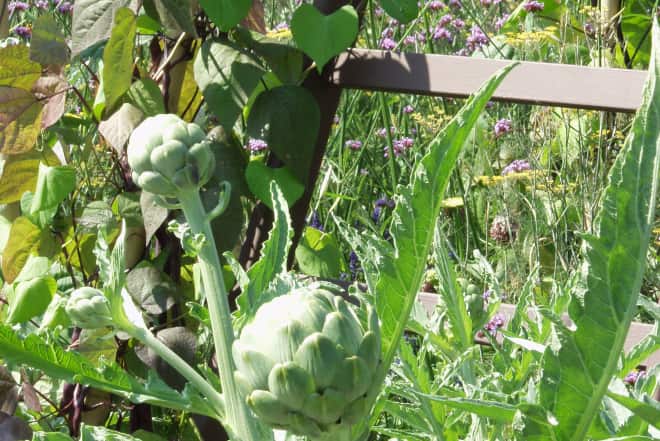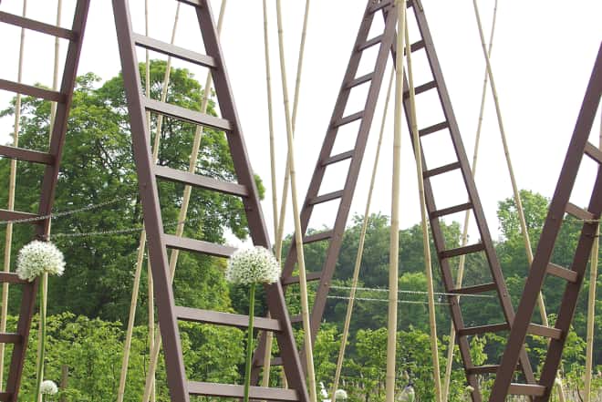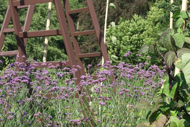 Leitern und Bohnenstangen verflechten sich zum räumlichen Gerüst des Gartens. In anregender Nachbarschaft wachsen Rotkohl und Lauch, Zinnien, Fenchel, Salbei, Mohn und Lilien, Artischocke und Iris. Bohnen und Winden klettern empor und wetteifern mit dem Stolz des Gärtners in den Himmel. Ganz ohne Anstrengung verwindet sich das Nützliche mit dem Schönen zu einem schmackhaften Gebinde.