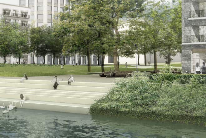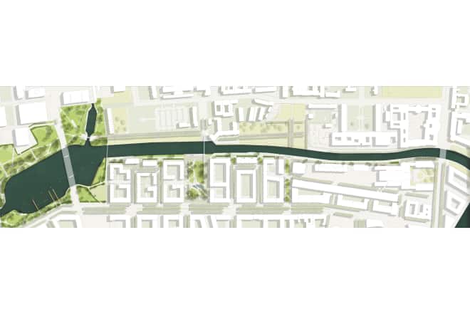 Strukturelle Grundlage des Konzepts ist die Schaffung einer exponierten, ‚steinernen’ Uferkante entlang des Berlin-Spandauer Schifffahrtskanals, die als Komplementär zum vegetativen Nordhafenpark aufgefasst wird. Die Promenade schafft einen Orientierungsraum im Stadtgrundriss und stellt die Verbindung zu übergeordneten Wegeverbindungen her. An die Uferpromenade schließt inmitten des Quartiers ein zentraler Stadtplatz an, der gestalterisch auf die Traditionslinie der Berliner Schmuckplätze Bezug nimmt.