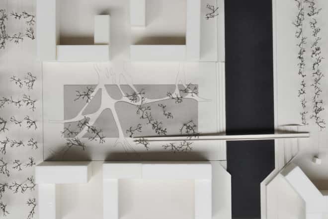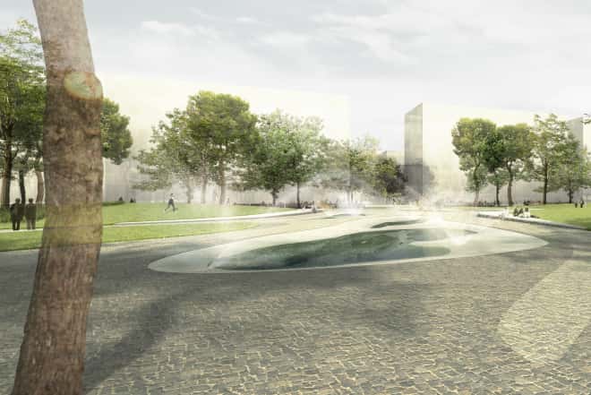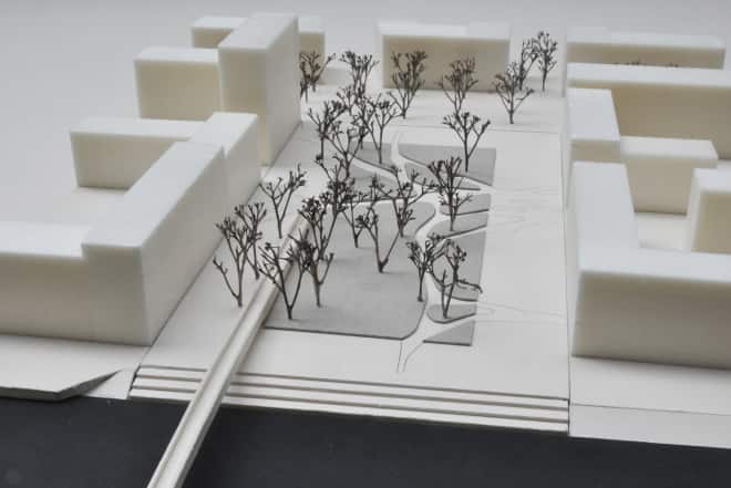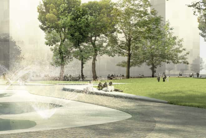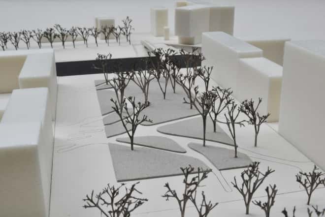 Der Platz gliedert sich in einen steinernen Rahmen und eine grüne, leicht topographisch modellierte Mitte, zwischen denen eine filigrane amorphe Bodenzeichnung und ein malerisch gruppierter Baumhain vermitteln.
