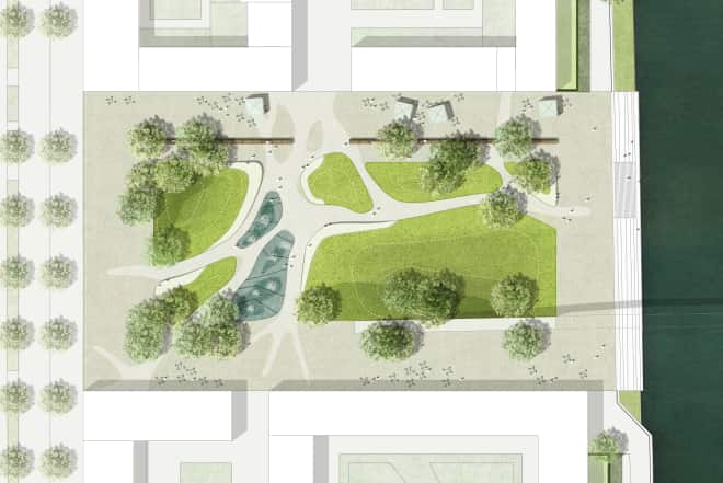 Im Norden führt die Uferpromenade zum Nordhafenpark, der durch das im 19. Jahrhundert von Lenné konzipierte Hafenbecken geprägt ist und in den 1950er Jahren zum öffentlichen Grünraum umgestaltet wurde. Die landschaftlichen Parkszenen und Gartenräume dieses hybriden Ortes wurden saniert und zu einem optisch prägnanten Quartierspark entwickelt. Am Übergang von Promenade und Park entsteht eine große Spielfläche mit Angeboten für unterschiedliche Altersgruppen.