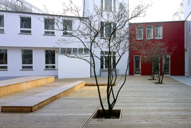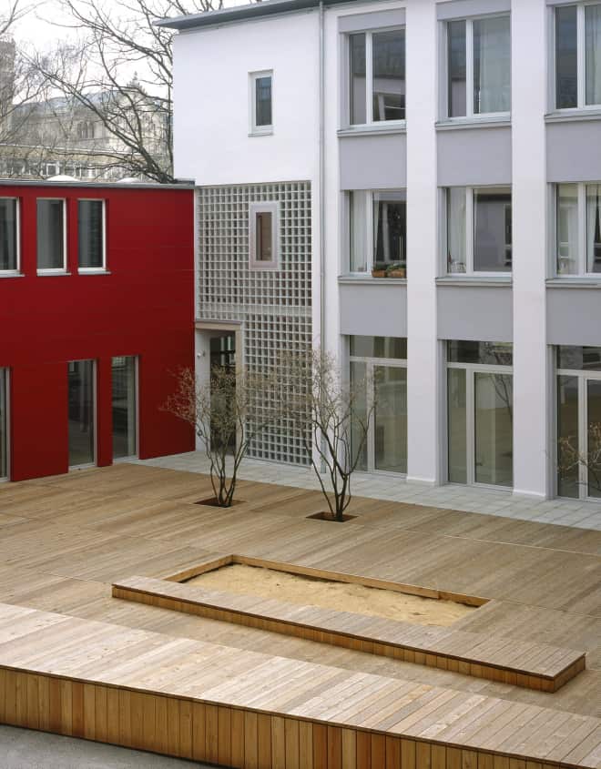 Ein Holzdeck überspannt den bestehenden Asphaltbelag und formuliert einen Aufenthaltsraum der gegenüber der Verkehrsfläche leicht herausgehoben ist. Sitzobjekte falten sich aus der horizontalen Holzlattung heraus, eine Vertiefung formt eine Sandspielfläche. Schirmförmige Ziergehölze (Amelanchier lamarckii) werfen in lockerer Verteilung ihren Schatten auf das Holzdeck.