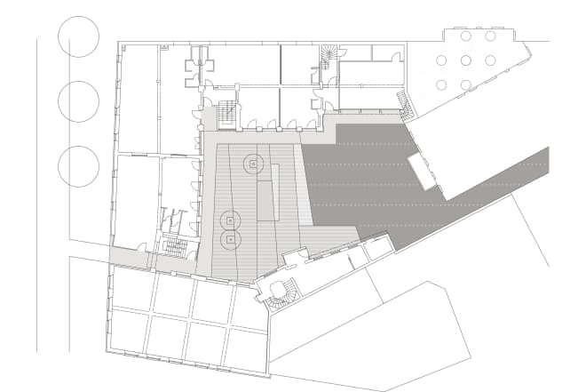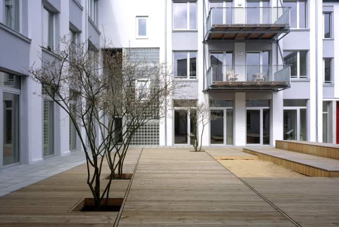 Das ehemalige Betriebsgelände der Hahn-Druckerei wird zu einem modernen Arbeits- und Wohnstandort umgebaut. Das zwei- bis dreigeschossige Gebäude umschließt einen Innenhof, der über eine Durchfahrt mit der Straße Im Moore verbunden ist. Ein neu angelegter Durchgang öffnet den Standort zum angrenzenden Welfengarten und zur Universität im Welfenschloss. Der Innenhof bildet das Herzstück des Ensembles. Wohnungen, Ateliers und Büroeinheiten unterschiedlicher Größe orientieren sich mit Zugängen und Fenstern zum Hof.