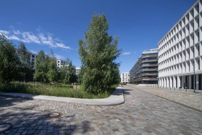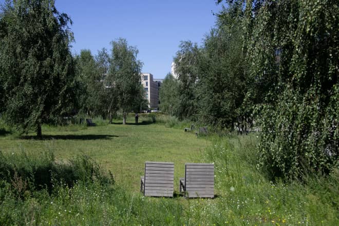 Mit diesem urbanen Boskett wurde ein Motiv entwickelt, das im in Konversion befindlichen Stadtquartier eine eindeutige Adresse bildet. Der Hain schafft sowohl ein prägnantes Bild wie ein poetisch-assoziatives Initial. Die Stellung der Birken interagiert mit der gestreckten Raumfigur und nimmt Bezug auf die Richtungsvorgabe der früheren Bahnnutzung. Die Konturen des Hains definieren einen Möglichkeitsraum zum klimatisierten Ausruhen, zum Wahrnehmen anderer atmosphärischer Qualitäten oder zur Erkundung des städtischen Lebens.