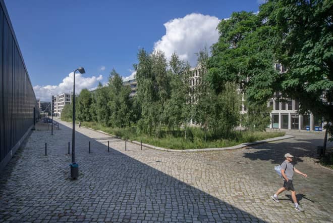 Das Konzept betont den Unterschied des Kunstcampus zu den meist überschaubaren, orthogonalen Platzflächen der neuentstehenden Europacity und zu den stark frequentierten Infrastrukturen der Invalidenstraße und der Heidestraße. Ziel war die Schaffung eines Ortes, der Verlangsamung zulässt und für Anwohnerinnen und Touristinnen das Potential eines Rückzugsraumes bietet. Dazu wurde in dessen Zentrum als markante gestalterische Geste ein urbanes Boskett ausformuliert. Konzipiert ist es als Folge von drei Teilräumen, die durch ihre trapezoiden Grundrisse mit abgerundeten Konturen aufeinander Bezug nehmen. Das nördliche und südliche dieser „Kabinette“ erhielt einen klar konturierten Rahmen aus hellem Granit, der in seiner Breite variiert und einen leicht eingesenkten und sanft modellierten Wiesenspiegel fasst. Die mittlere, als Spielort gestaltete Fläche wurde mit einer Hainbuchenhecke eingefasst. Verbunden sind diese drei Bereiche durch einen Hain aus ein- und mehrstämmigen Birken.