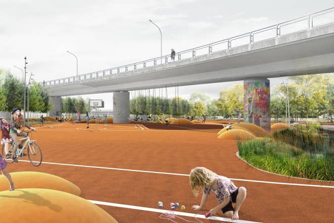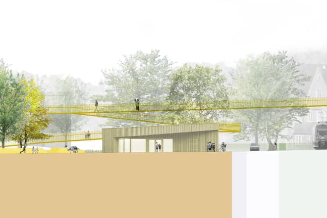 Die Freiräume der Jagstaue werden mit der Ellwanger Altstadt durch eine Fußgängerbrücke verbunden, die sich in das Areal des Brückenparks hineinfaltet. Im Brückenpark ziehen sich vielfältige Sport- und Aktivitätsflächen entlang des Mühlgrabens bis ans Jagstufer.