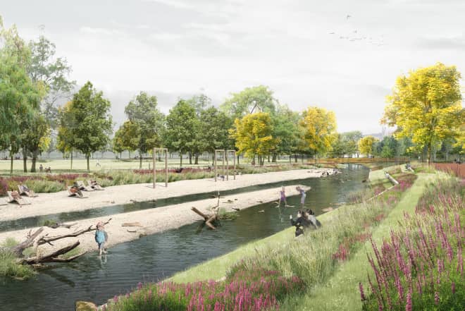 Im Konzept wird die Renaturierung der Jagst und die damit verbundene Absenkung des Wasserstands nicht als historisierende Geste, sondern als Impuls für eine ökologische Aufwertung und neue Freiraumnutzungen aufgefasst.