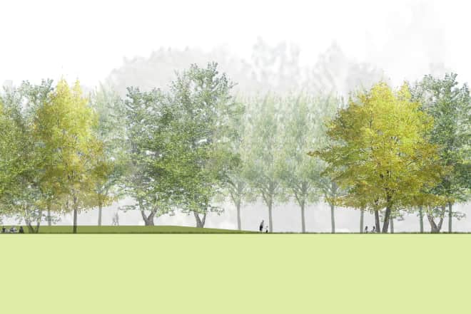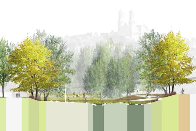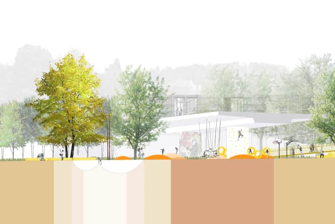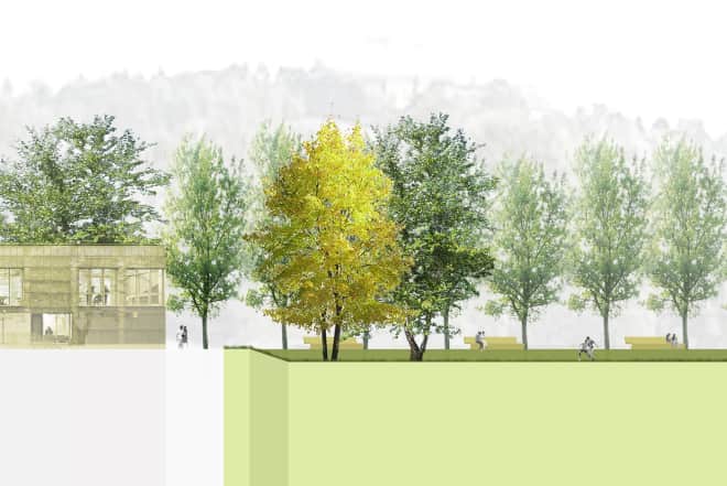Die Flussaue wird als großzügiger Bezugsraum im urbanen Gefüge ausformuliert. Sie wird durch weite Flussterrassen gefasst, die die Orientierung auf die Jagst stärken und eine räumliche Hierarchie ausformulieren.