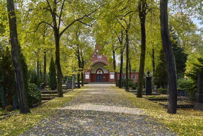 Die lückige Alleenstruktur wurde durch Nachpflanzungen ergänzt und die Wegefläche erhielt aufgrund der Gefällestruktur und der erforderlichen Befahrbarkeit einen Belag aus Naturkleinsteinpflaster. Eingangsbereich, Rondellplatz und Kapellenplatz wurden gestalterisch aufgewertet und im Sinne des ursprünglichen Friedhofskonzepts wieder zu Orten mit Aufenthaltsqualität entwickelt. Aufgrund der Quellen- und Bestandssituation zielte diese Maßnahme nicht auf eine Rekonstruktion, sondern auf eine Neuinterpretation nachweisbarer Gestaltungsthemen und Pflanzmotive, die jedoch als neue Gestaltungsschicht kenntlich sein sollten. Umgesetzt wurde dies in allen drei Bereichen durch differenzierte ornamentale Hecken- und Staudenpflanzungen, die den gestalterischen Zusammenhang der Allee stärken. Auf diese Weise konnte die Hauptstruktur der Friedhofsanlage in ihrer räumlichen Qualität und mit den sie prägenden Ausstattungselementen wiedergewonnen werden. Das Zentrum des Rondellplatzes bildet nun eine Wasserfläche mit Springstrahl, die zugleich einen akustischen Akzent gegen den Verkehrslärm des Umfeldes setzt. Im Bereich des Kapellenplatzes wurde ein Schöpfbrunnen geschaffen und ein während des Bauprozesses in situ freigelegter Pflasterbelag aus der Entstehungszeit des Friedhofs aufgenommen und gestalterisch integriert.