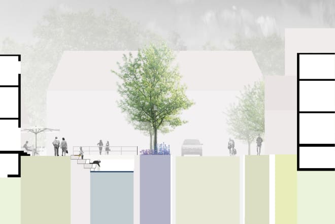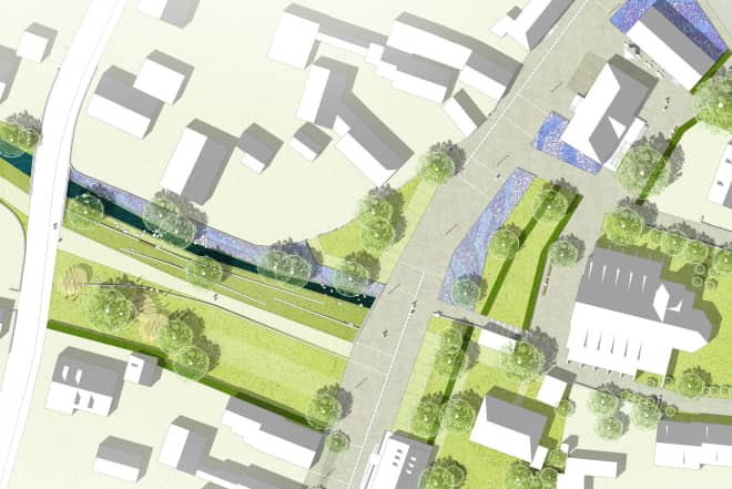 Dazu werden im Konzept drei Ansatzpunkte genutzt. Der erste ist die Gestaltung einer grünen Ortsmitte. Bei dem zweiten handelt es sich um die Kennzeichnung und teilweise Freilegung des Verlaufs des für die Gemeinde namengebenden Güßbachs. Drittens geht es uns um die Neuordnung der das Stadtimage prägenden Situation im Kreuzungsbereich nordwestlich der Kirche, wofür die entwickelte Neubebauung des Grundstücks Lichtenfelser Straße 2 entscheidend beiträgt.